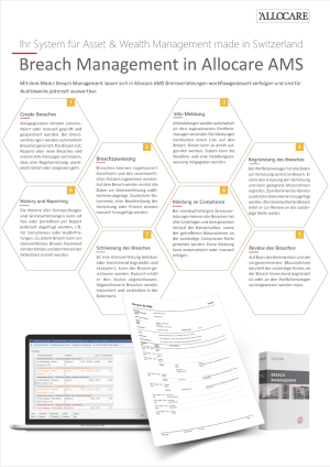 - Verschiedene länderspezifische, gesetzlich vorgeschriebene Regelsets wie BVV2, KAG, KVG, UCITS V, MiFID II, aber auch individuelle Regeln, sowohl pre- wie post-trade inklusive Breach Management und Audit trails