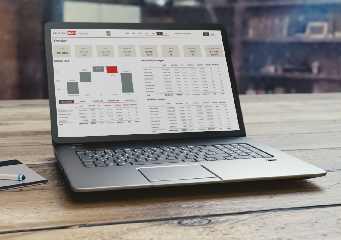 Ob Portfolios, Kunden, AuM, Profitabilität oder Performance – aggregiert, nach verschiedenen Kriterien gefiltert wie z. B. Kundenbetreuer, Depotbank, Risikoprofil, Domizilland der Kunden oder bis ins Detail analysiert – nur mit präzisen und aktuellen Daten lassen sich Chancen und Risiken erkennen und die richtigen strategischen Weichen stellen. Allocare DASH visualisiert die notwendigen Informationen – aktuell, verständlich und jederzeit einfach abrufbar.